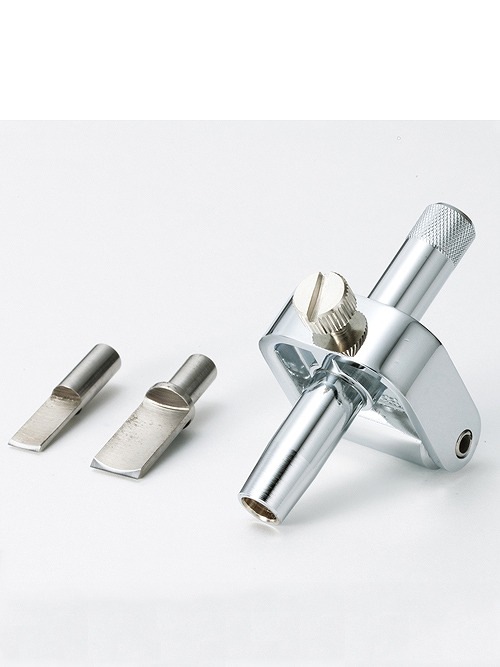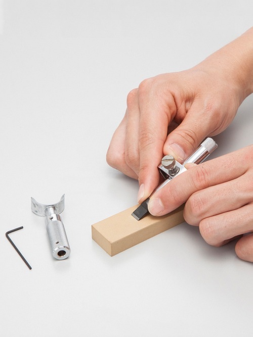 使用方法スェーベルナイフから刃をはずし、角度調整機の先端へ付け替えます。刃先を オイルストーンの上にのせ、角度を合わせて研ぎます。