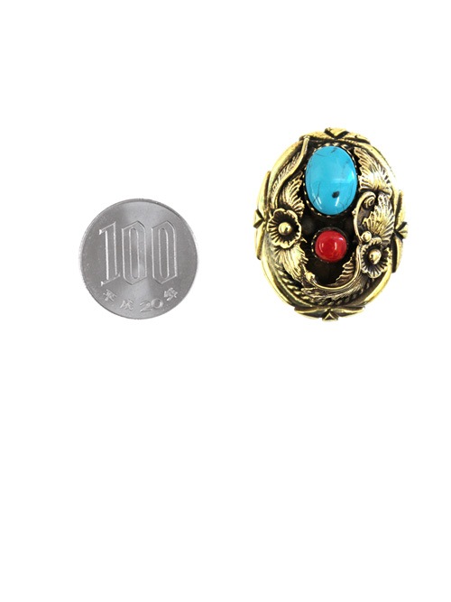 材質:台座/真鍮製、石/ブルーターコイズ・赤サンゴ(再構築石)