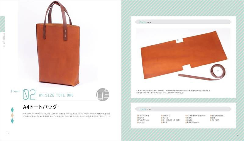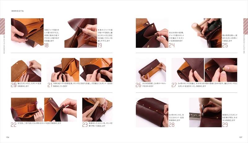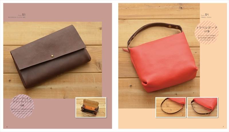 レザークラフト用品の販売を手がける「SEIWA」のプロデュースにより、レザークラフトの初心者でも作りやすいように設計された、6つの革カバンの作り方を詳細に解説します。内縫いの練習にもなるスマートフォンポーチ。誰もが作りたいと思うシンプルなA4サイズのトートバッグ、縫わずにカシメで留めるだけで作るアコーディオンクラッチバッグ、ファスナーを使ったトラベルポーチ、今流行している2ウェイタイプのクラッチバッグ、そして工具がきっちり収まるツールバッグと様々なタイプのカバンの作り方を紹介しています。どれも革カバン作りの基本的な技術を使っているので、応用して自分だけのバッグを作る基礎にもなります。