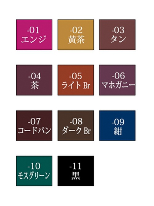 カラー:01 エンジ、02 黄茶、03 タン、04 茶、05 ライト Br、06 マホガニー、07 コードバン、08 ダーク Br、09 紺、10 モスグリーン、11 黒