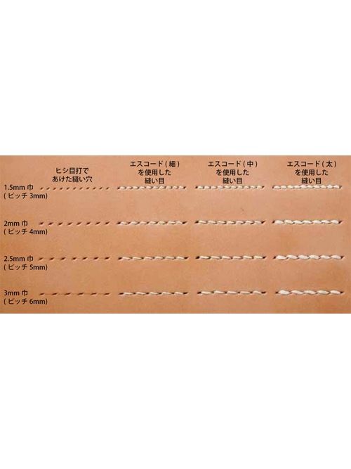 刃巾により縫い目のピッチは異なり、革厚や使用する糸の太さ、そして作品の雰囲気に応じて使い分けます。一般に薄く柔らかい革は狭い巾に細い糸、厚く硬い革は広い巾に太い糸が向いています。用途に合わせてお好みの組み合わせをお選びください。