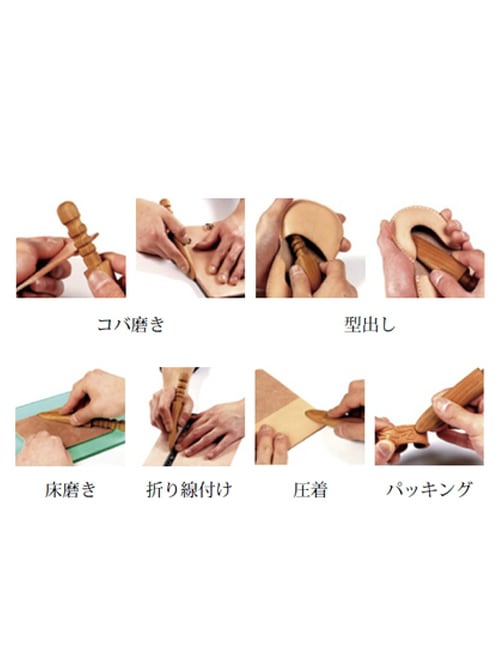 小田原の木工職人によるクラフト社オリジナルのウッドスリッカーです。安定した品質を保ち、木材には緻密で強靭な桜の無垢材を使用しているので、コバや床面を美しく磨き上げることができます。コバ・床磨き以外にもレザークラフトの様々な工程で活躍するマルチツールです。