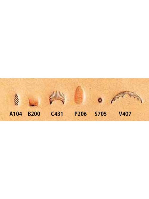 基本刻印6本(A104,B200,C431,P206,S705,V407)、スーベルカッター(S)、木槌(並)、ゴム板(中)