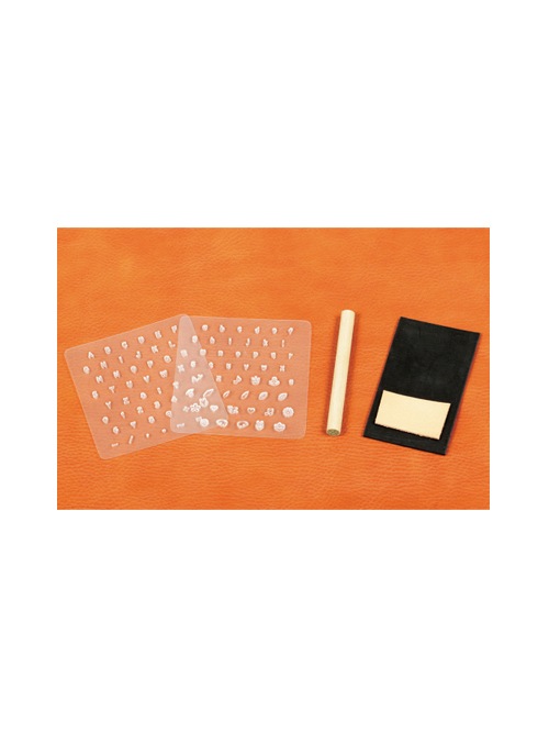 打棒を使ってタンニン鞣し革に打刻する特殊なシート状の樹脂製刻印です。薄く柔軟性があるため扱いやすく、透明なので文字の間隔や位置を調整しやすいのが特徴です。刻印サイズは約4mm。文字はアルファベット(大文字・小文字)、ひらがな、カタカナの3種類で、それぞれにおまけの絵刻印が付いています。レザーアイテムへの名入れなどに最適です。