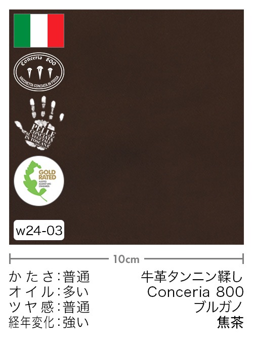 イタリア(ITALY)のコンセリア800(Conceria 800)は、イタリア植物タンニンなめし革協会(CONSORZIO VERA PELLE ITALIANA CONCIATA AL VEGETALE)に加盟しており、LWGゴールドレート認証(LEATHER WORKING GROUP GOLD RATED)を取得しています。