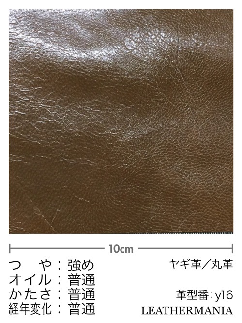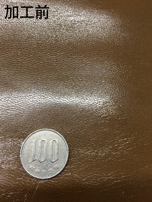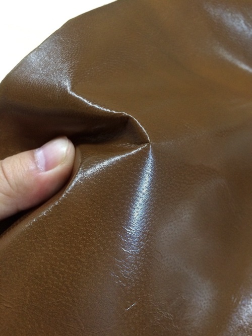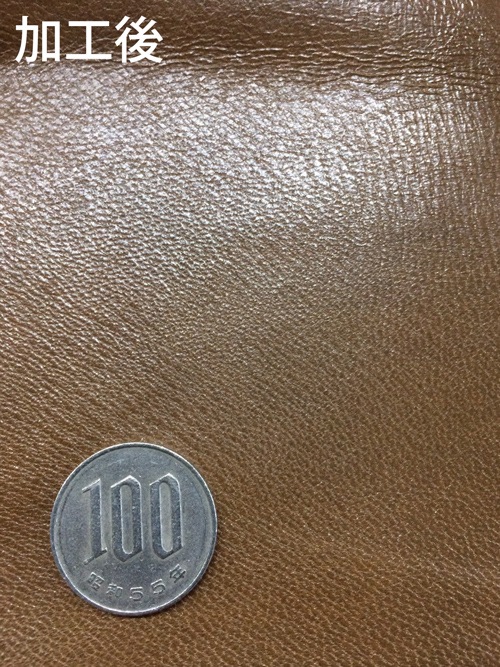このヤギ革はつやとハリがあります。銀面をもみほぐすとシボが入りやすいので、味出しなどの二次加工に向いています。もむ量を増やすと、つやが減り色は薄くなります。