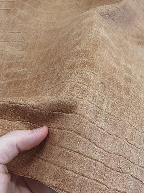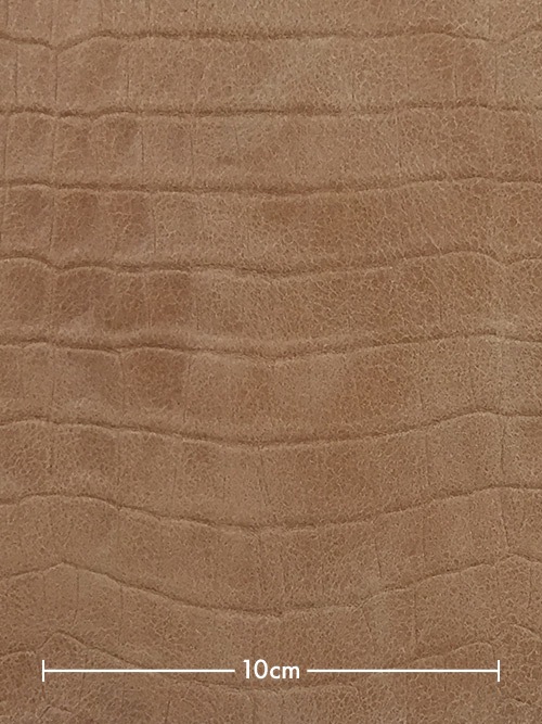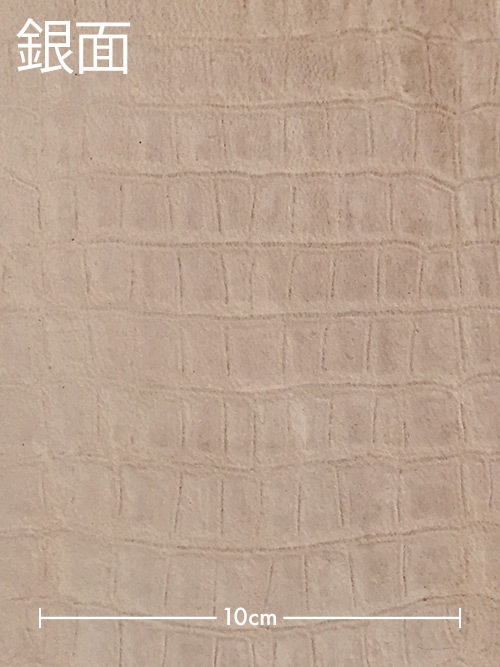 銀面をサンドペーパーで削り味を出しています。床面にワニの型押しと裏処理加工を施しているので、両面使いが楽しめる革です。