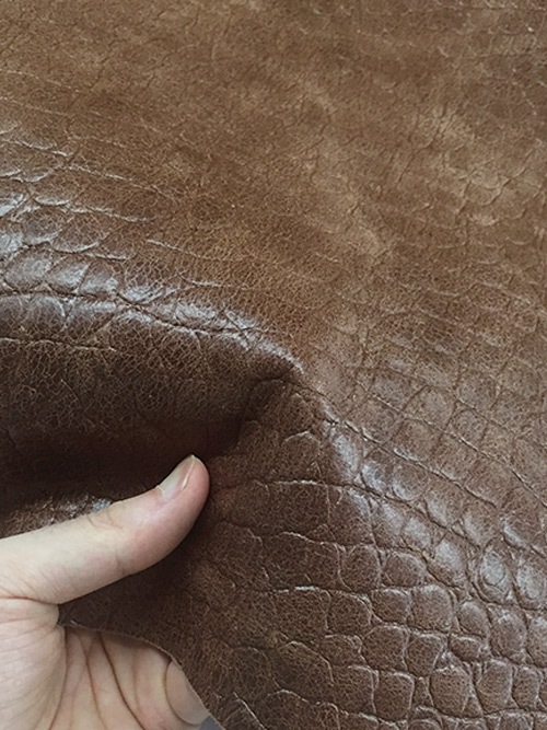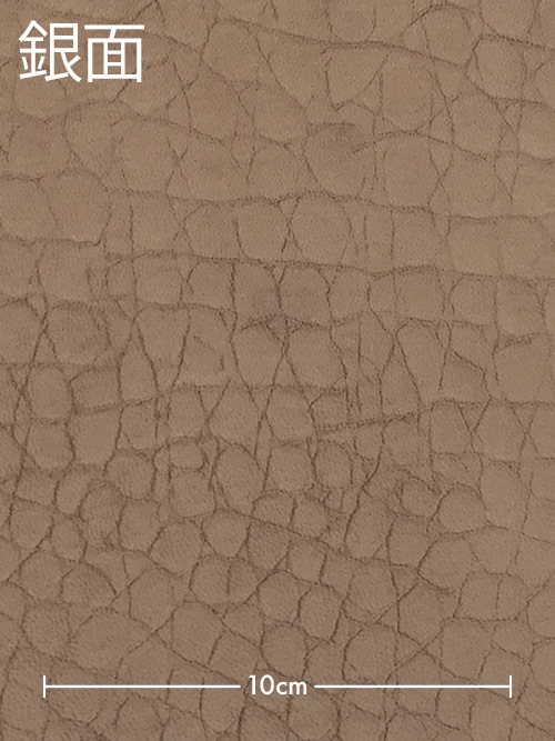 銀面をサンドペーパーで削り味を出しています。床面にワニの型押しと裏処理加工を施しているので、両面使いが楽しめる革です。