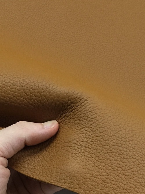 この革は化学薬品でシボを寄せ、独自のクローム鞣しの後、顔料仕上げされたフランス産カーフです。独特のしなやかなコシと繊細なキメの細かさ、発色の良さなどから「世界中の高級メゾン」から支持を得ています。生後3~6ヶ月の仔牛の原皮を使用しているため繊維が密ですので型崩れがしづらいです。肉厚でコシがありながらも軽く、柔らかな手触りの世界最高峰のカーフスキンをご堪能ください。