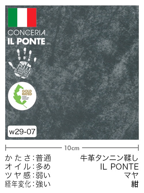 イタリア(ITALY)のイル・ポンテ(IL PONTE)は、イタリア植物タンニンなめし革協会(CONSORZIO VERA PELLE ITALIANA CONCIATA AL VEGETALE)に加盟しており、LWGゴールドレート認証(LEATHER WORKING GROUP GOLD RATED)を取得しています。