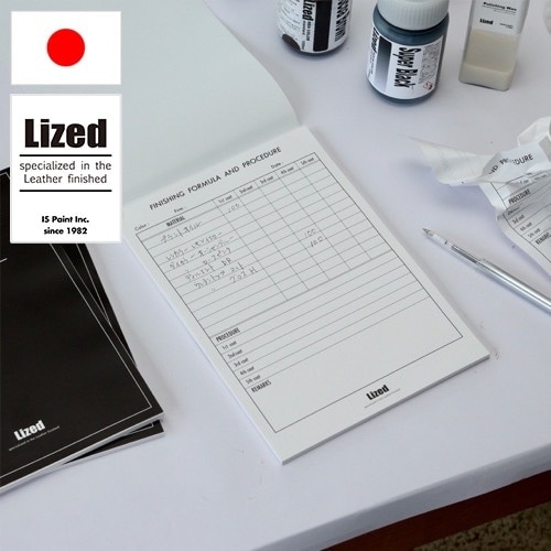 Lizedが革をイジる人に提案するメモ帳です。これがあれば、塗料を混ぜた時、革を染めた時などを再現するのに最短距離で革と向き合えます。「こんなフォーマットがあると今後のものづくりに繋がりますよ」