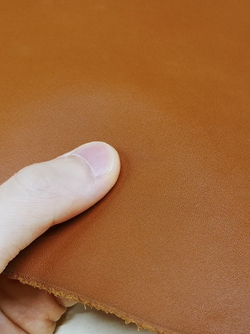 この牛タンニン革は、セミアニリン仕上げです。細かなシボの型押しを施しているため、革全体のシボ感が均一で裁断効率が良好です。また、傷やスレにも強いため革小物の内装パーツにもおすすめです。