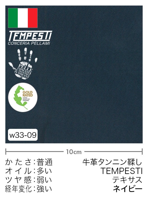 イタリア(ITALY)のテンペスティ社(TEMPESTI)は、イタリア植物タンニンなめし革協会(CONSORZIO VERA PELLE ITALIANA CONCIATA AL VEGETALE)に加盟しており、LWGゴールドレート認証(LEATHER WORKING GROUP GOLD RATED)を取得しています。