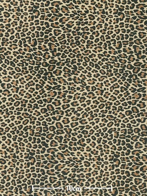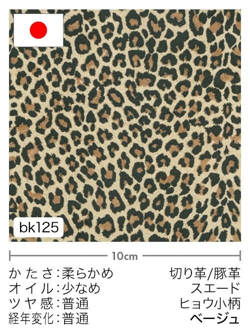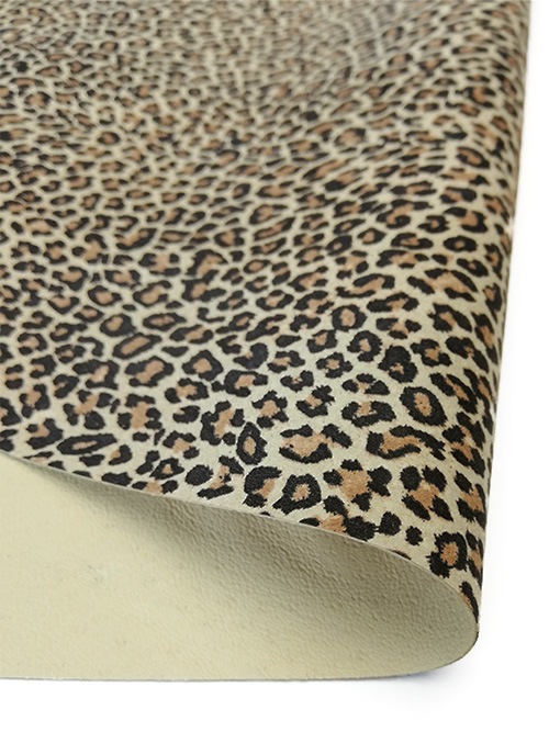 日本産豚革の床面(ピッグスエード)にヒョウ柄(小)の転写プリントを施しています。ヒョウ柄は大胆な印象を与えるため、ワイルドでゴージャスなアイテムにお勧めの素材です。