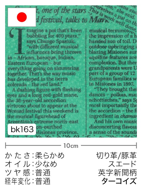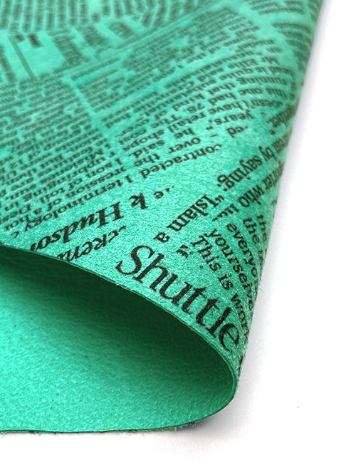 日本産豚革の床面(ピッグスエード)に英字新聞柄の転写プリントを施しています。インテリジェンスな印象を与えるデザイン性の高い革素材です。