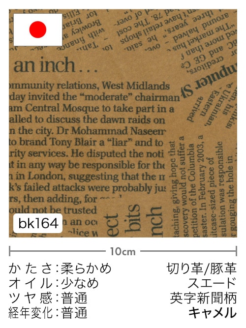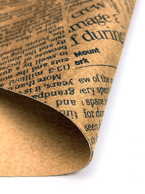 日本産豚革の床面(ピッグスエード)に英字新聞柄の転写プリントを施しています。インテリジェンスな印象を与えるデザイン性の高い革素材です。