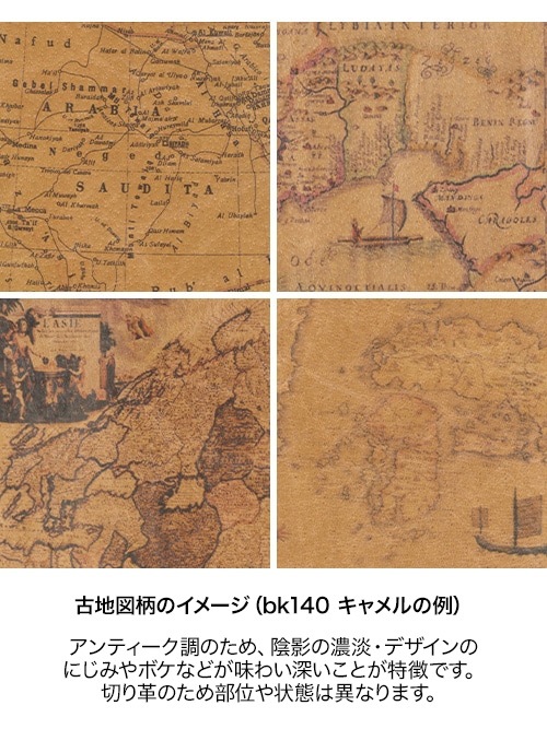 日本産豚革の銀面に古地図柄の転写プリントを施しています。デザイン性の高いアンティーク調の革素材です。