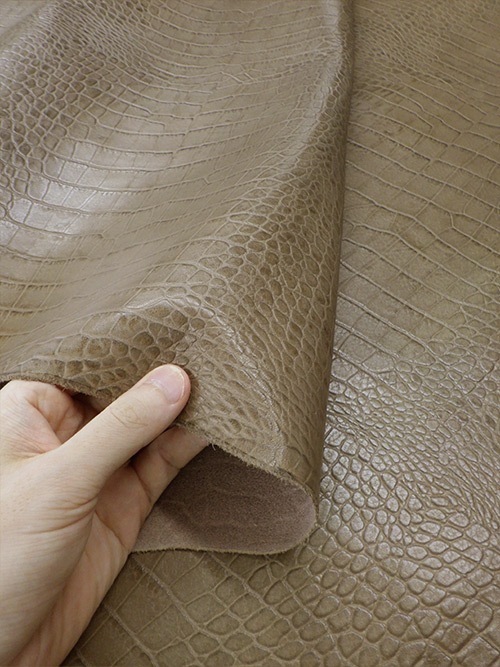 この牛クロム革は、ワニの型押しと頭張り加工(凸部を磨き摩擦熱による味出し)を施したレザーです。