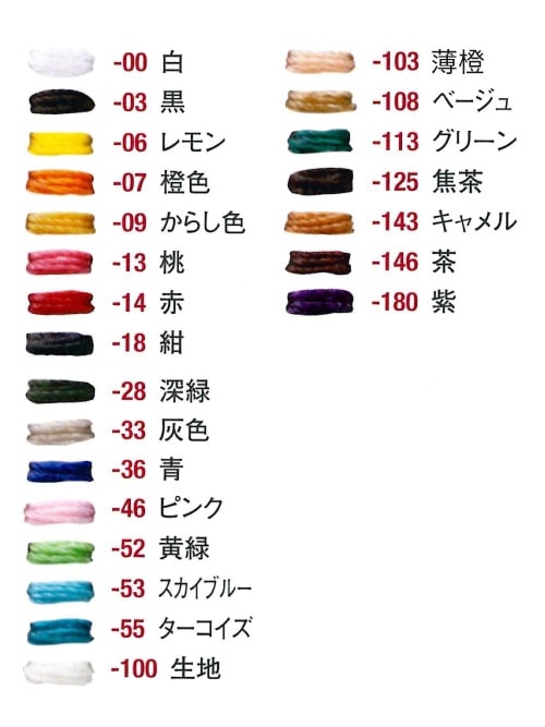 カラー:00 白、03 黒、06 レモン、07 橙色、09 からし色、13 桃、14 赤、18 紺、28 深緑、33 灰色、36 青、46 ピンク、52 黄緑、53 スカイブルー、55 ターコイズ、100 生地、103 薄橙、108 ベージュ、113 グリーン、125 焦茶、143 キャメル、146 茶、180 紫