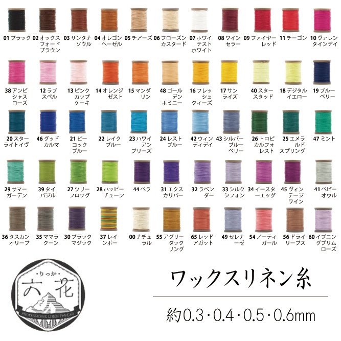 自然で優しい色合いから、くっきりと際立つビビッドカラーまで、実に豊富なバリエーションを持つ六花(りっか・リゥファ)のワックスリネン糸。弾力性に優れた天然のリネンを使用し、独自の製法により、しっかりとロウが付いていながらもベトつきにくく糸滑りの良い仕上がりとなっています。また、SGSの物理および化学試験の非毒性、非退色の要件を満たし、ヨーロッパの安全規格にも適合しています。