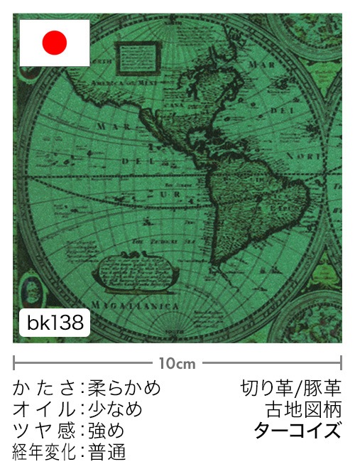 日本産豚革の銀面に古地図柄の転写プリントを施しています。デザイン性の高いアンティーク調の革素材です。