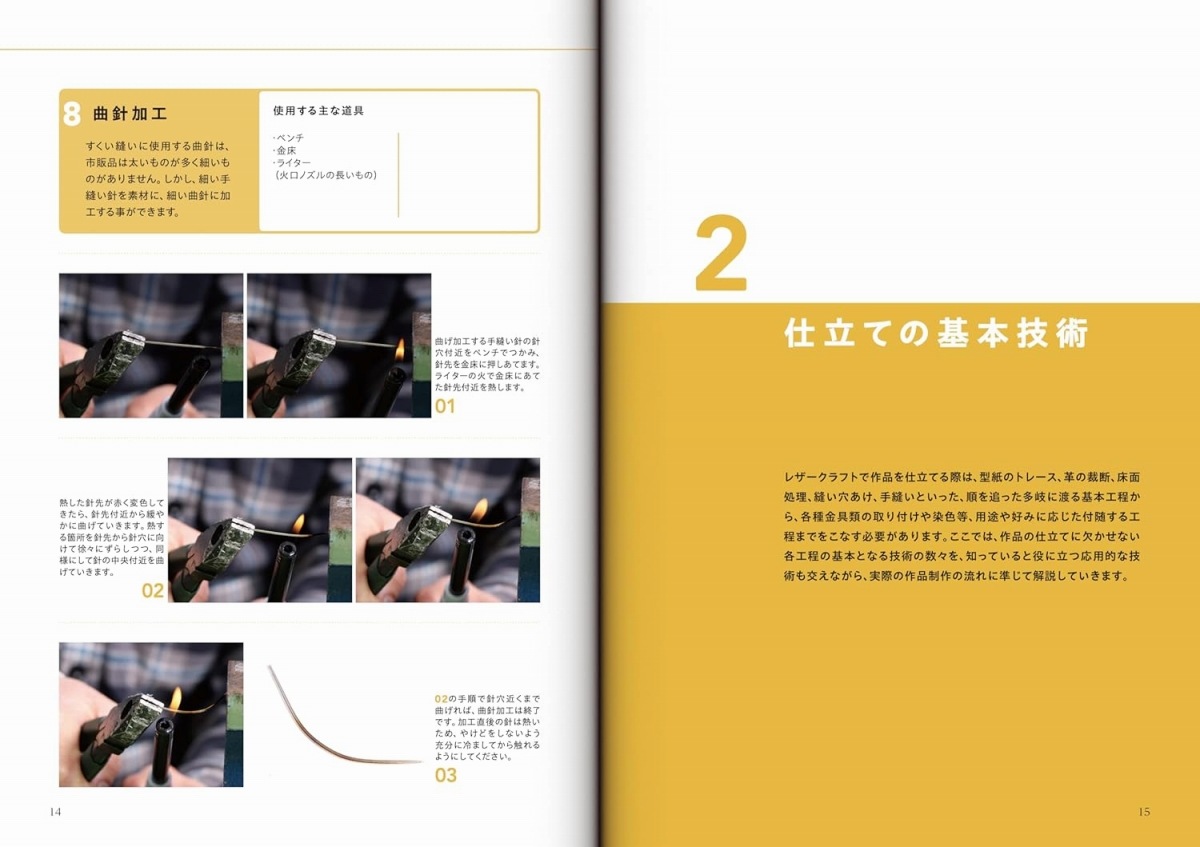 トレース / 裁断 / 手漉き / 床面処理 / 接着 / 縫い穴あけ / 糸と針の準備 / 手縫い / コバ処理 / 捻入れ / レースかがり / 各種金具の取り付け / ファスナー / 革の加工 / 染色