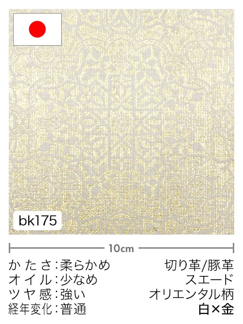 日本産豚革の床面(ピッグスエード)にオリエンタル柄の箔押し(フィルム加工)を施しています。トラディショナルで異国風なデザインの革素材です。