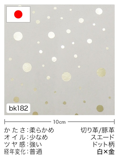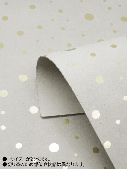 日本産豚革の床面(ピッグスエード)にドット柄の箔押し(フィルム加工)を施しています。フェミニンで可愛らしいデザインの革素材です。